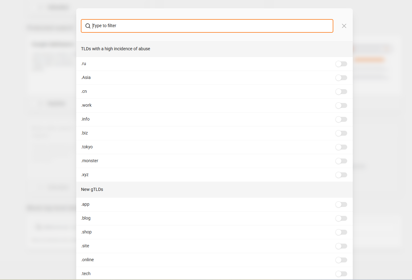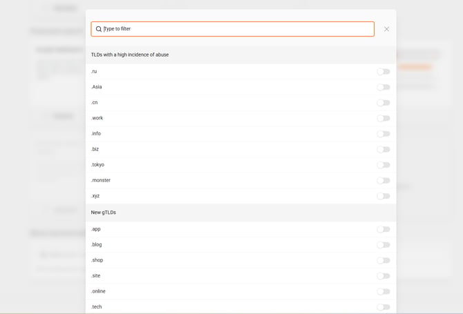 By clicking on the field, you will see the section of TLDs with a high incidence of abuse and other suggestions for blocking. If you want to block a specific TLD, simply search for the desired one and click on the block button.