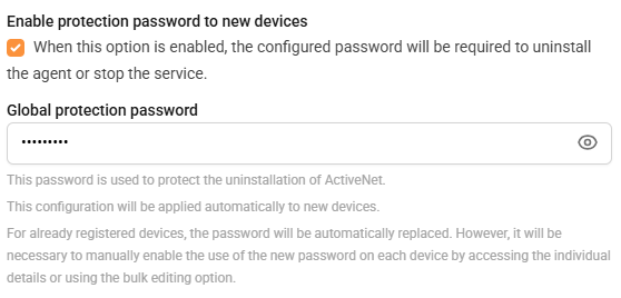 It is possible to create a default password to protect the agent. After creating the password, you must select which devices will be protected by the password. The field to enable the password is available by clicking on New Device.