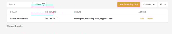 To use it, simply click on New DNS Forwarding and enter the Domain, DNS Server, and groups that should follow this forwarding rule.