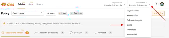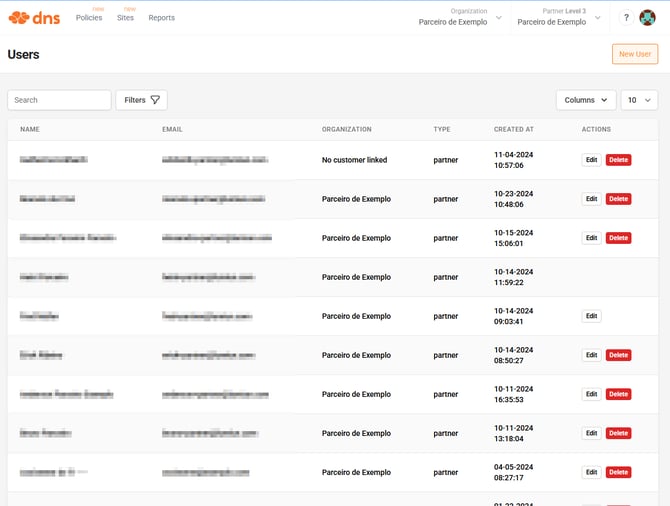 Through the Lumiun DNS partner menu it is possible to create users to access organizations and make the necessary changes. We recommend that this feature be used so that MSPs can keep their employees with access for possible configuration needs and the release/blocking of filters in Lumiun DNS. From this same page it is possible to create a user for the end customer, if necessary.