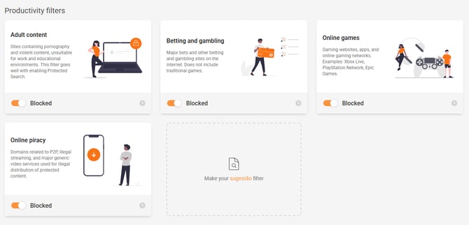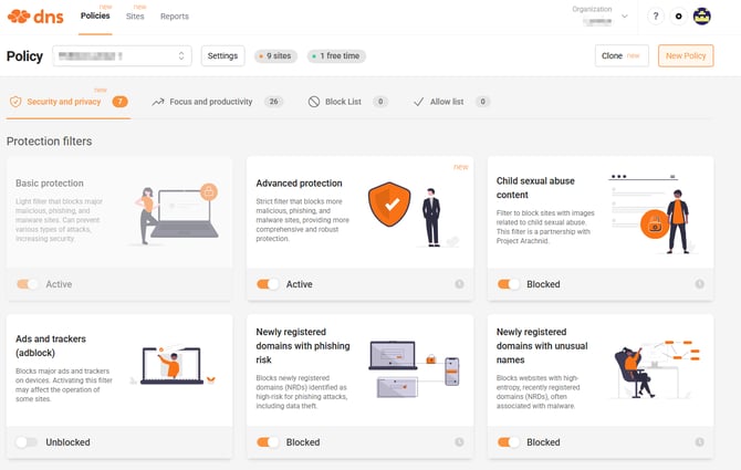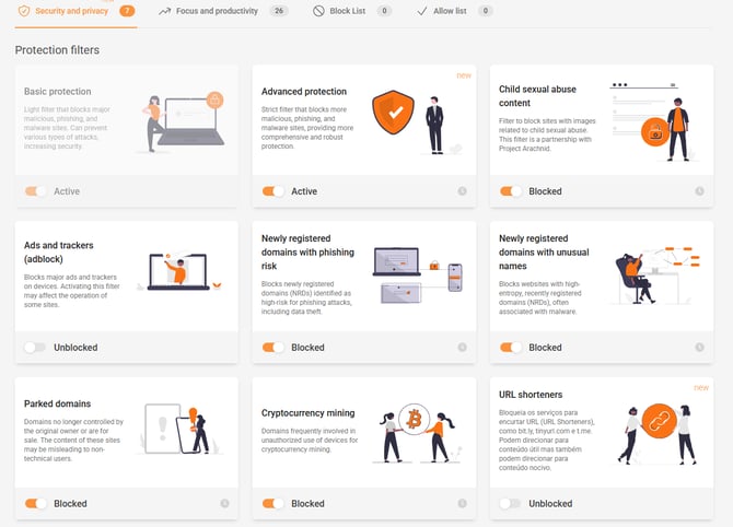 - Protection filters: This section contains the main protection filters against threats and unwanted content.
