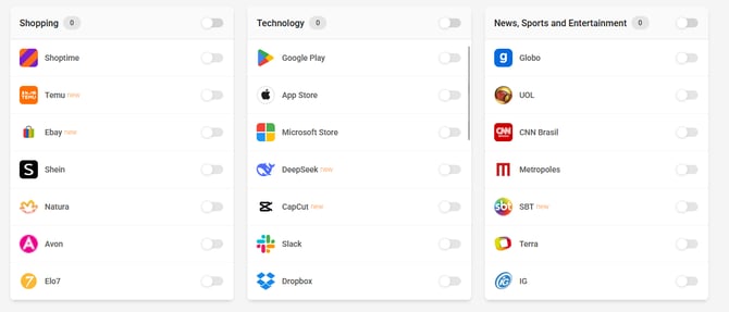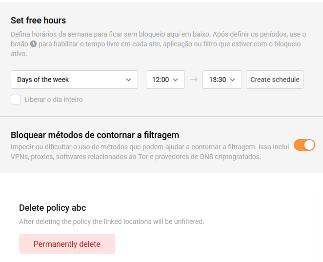 Policies are the control center of Lumiun DNS. They function as a set of rules applied to network devices, allowing you to define content blocks, release times, security filters and restrictions on search engines and YouTube.