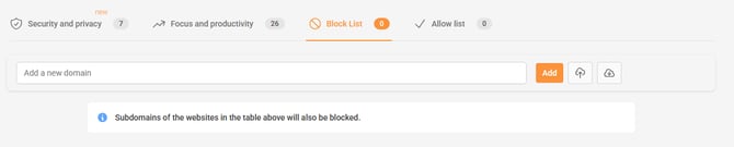 The Block List allows you to add specific domains that you want to block manually, even if they are not included in the standard filters. Simply enter the URL in the field provided and click Add.