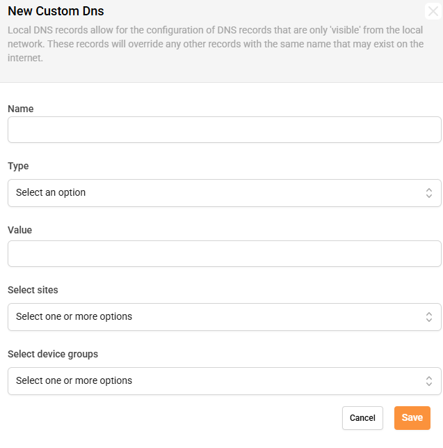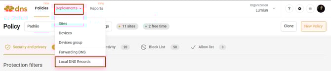 Through Lumiun DNS, it is possible to record a Local DNS that allows them to be “visible” only from the company's local network. These records will prevail over other possible records of the same name existing on the internet. Entries registered in Local DNS Records will be used to respond to queries for these names on the local network, ignoring other possible responses existing on the internet.
