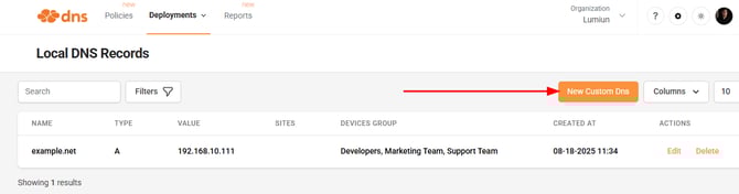 When you open it, you will see the records that have already been created (if any). To create a new one, simply click on New Custom DNS.