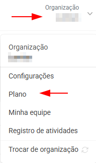 Para realizar a alteração do plano Lumiun DNS, você precisará estar devidamente logado. Após realizar o login, clique em Organização selecione a opção Plano.