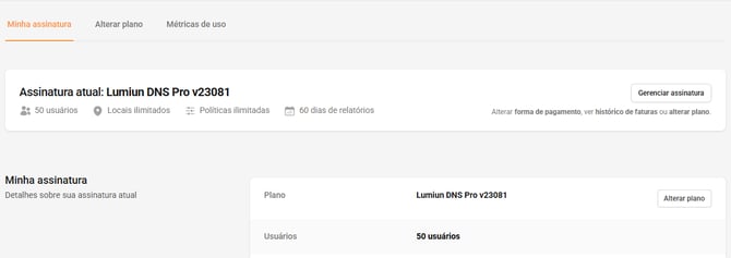 Ao clicar Plano você será redirecionado à página com as informações da sua assinatura atual.