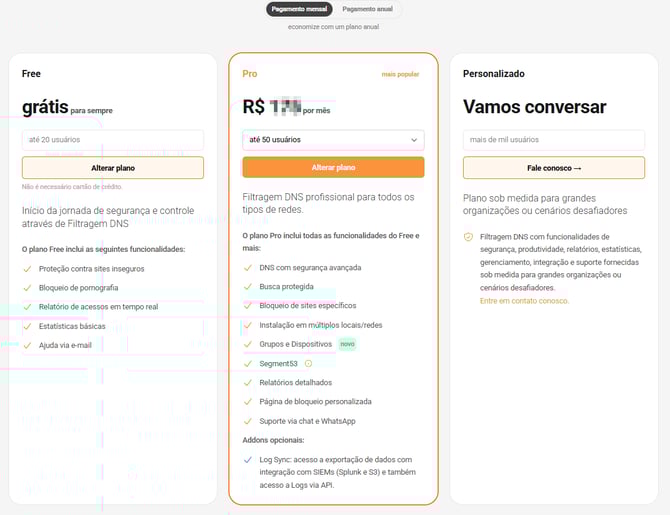 Pro: Locais e políticas ilimitados, usuários conforme a demanda. Horários de liberação, filtros complementares, página de bloqueio personalizáveis, além de todas as funcionalidades do plano Free.