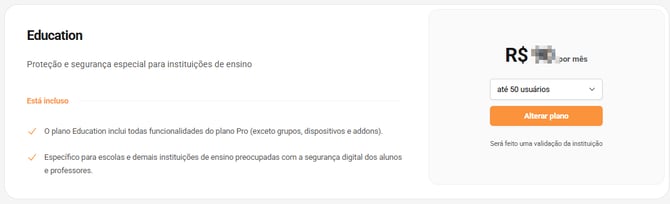 Education: Todas as funcionalidades do plano Pro (exceto Grupos e Dispositivos), mas disponível somente para Instituições de Ensino.