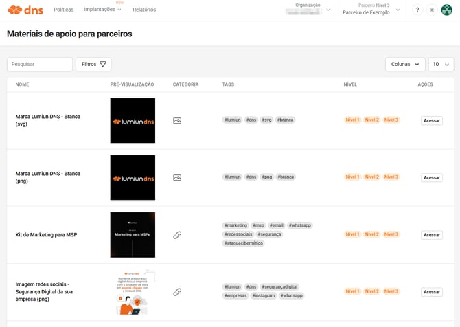 Neste página, se concentra todos os conteúdos criados para facilitar a comunicação e impulsionar os resultados nas áreas de marketing e comercial dos parceiros Lumiun, contendo inúmeros conteúdos, incluindo imagens, links, documentos, conteúdos personalizados e outros formatos. Para mais detalhes, confira nosso artigo Materiais de apoio para parceiros.