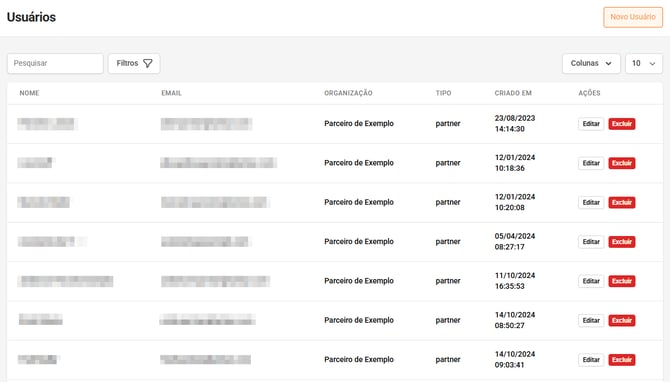 Nesta página, você pode visualizar todos os usuários criados, sendo possível criar usuários para acessar organizações e realizar alterações quando necessário. Para mais detalhes, confira nosso artigo Minha equipe | Parceiro Lumiun DNS.