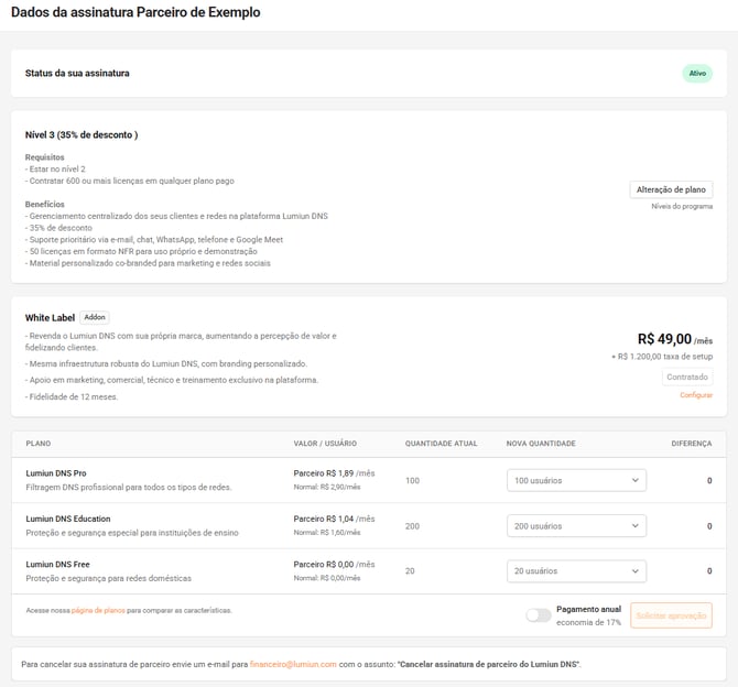 Nesta página, você pode consultar as informações da sua assinatura atual, incluindo os planos e número de usuários contratados e o seu nível de parceria. Além disso, é possível alterar o plano, adicionar mais usuários e ajustar a periodicidade do pagamento de acordo com a sua necessidade.