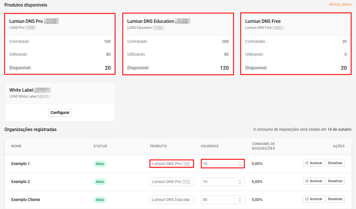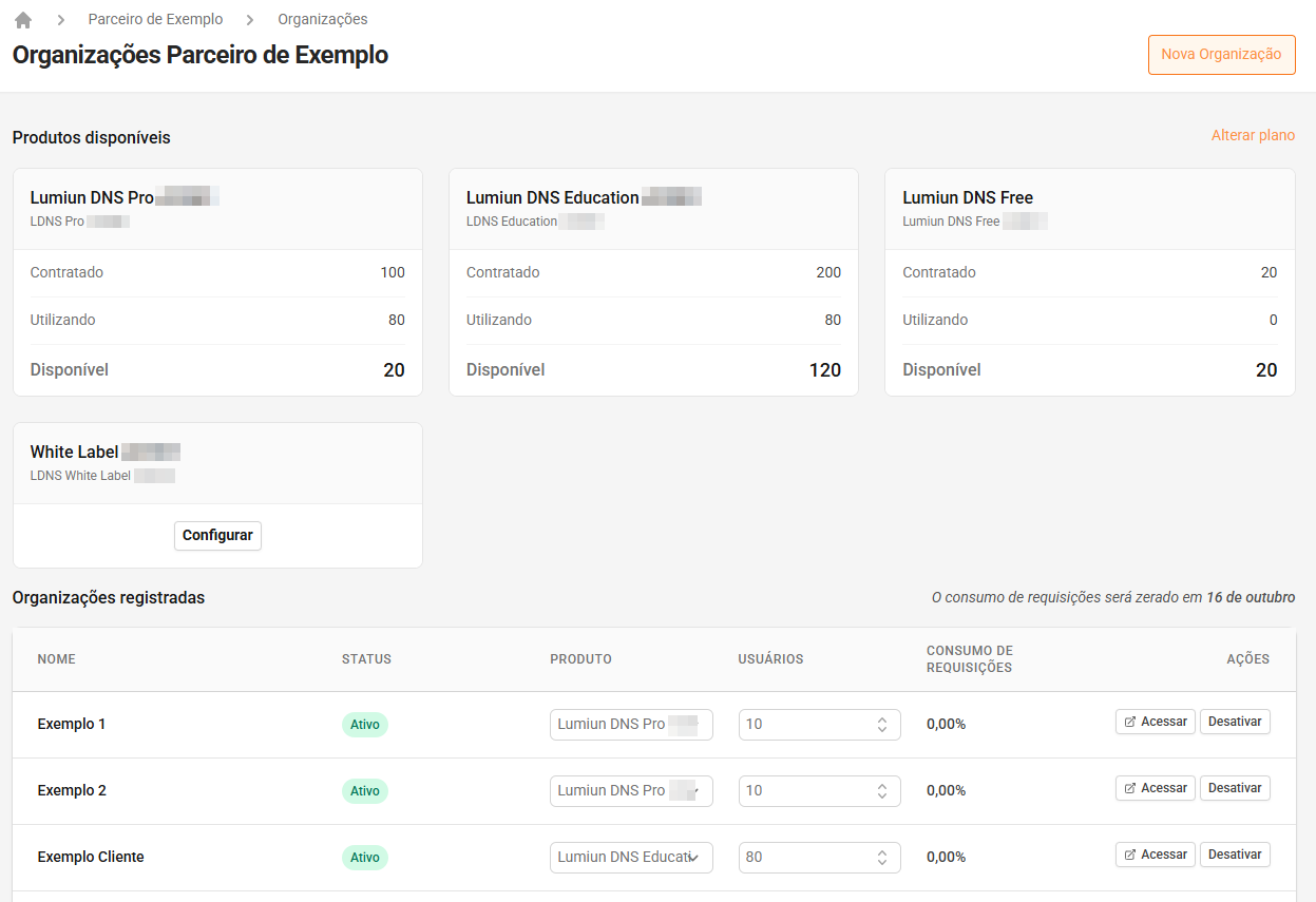 Crie e ajuste organizações pela conta de Parceiro do Lumiun DNS, distribuindo planos e usuários entre seus clientes.