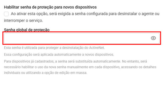É possível criar uma senha padrão de proteção do agente. Após a criação da senha, você deve selecionar quais dispositivos estarão sob proteção da senha. O campo para habilitar a senha está disponível ao clicar em Novo Dispositivo.