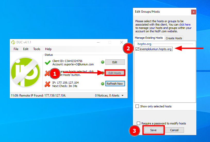 Passo a passo para instalar e configurar o cliente do serviço No-IP em Windows. Útil para usar o Lumiun DNS via protocolo DNS53 em uma rede que não possui endereço IP público fixo.