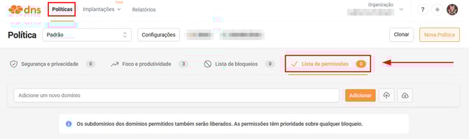 - Acesse a página de Políticas e clique na aba Lista de permissões.