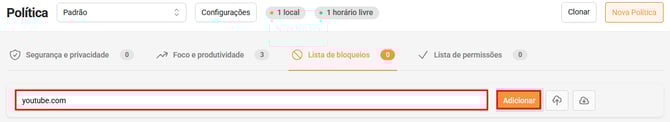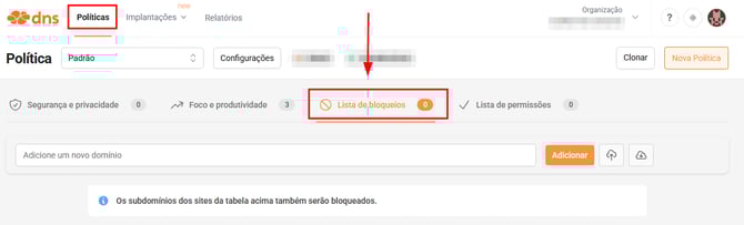 - Acesse a página de Políticas e clique na aba Lista de bloqueios.