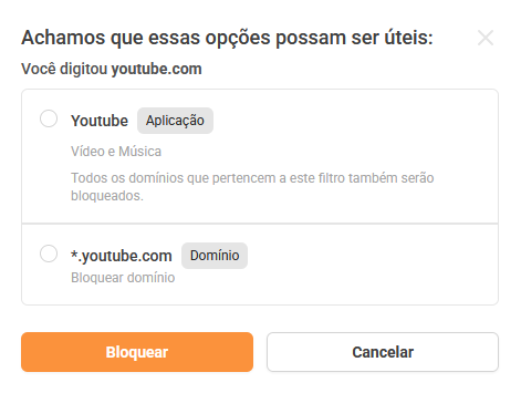 - Vale ressaltar que caso o domínio escolhido já esteja atribuído a um filtro ou aplicação, você terá a opção de bloquear este filtro/aplicação ou apenas o domínio. Caso não pertença, ele será adiciona a lista sem interferência.