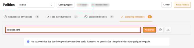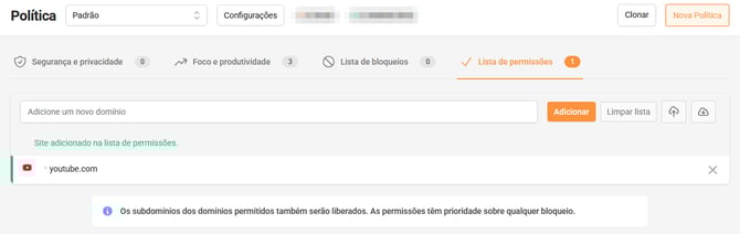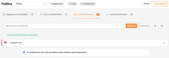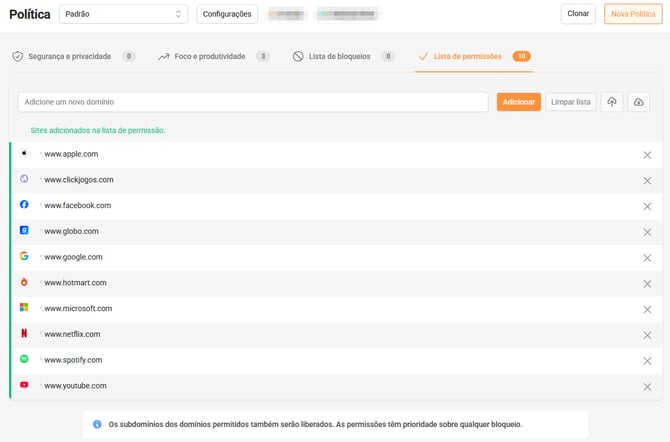 - Após isso, sua lista de domínios será adicionada a lista de permissões ou bloqueios.
