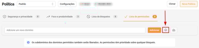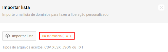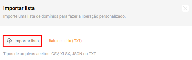 Se você deseja realizar liberações ou bloqueios em massa, em vez de adicionar um domínio por vez, é possível importar uma lista utilizando arquivos nos formatos CSV, XLSX, JSON ou TXT. Confira abaixo o passo a passo: