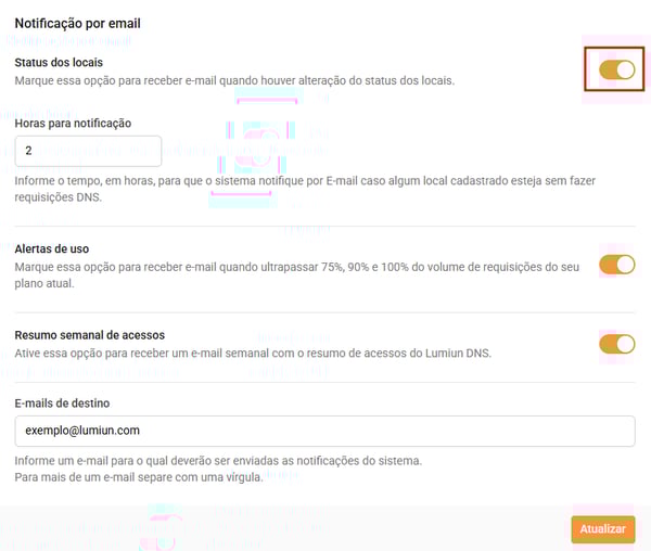 Como ativar as notificações por e-mail através do Painel do Lumiun DNS
