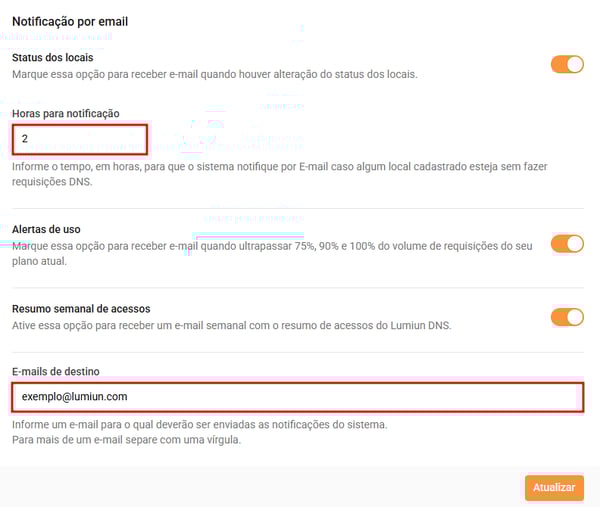 - Horas para notificação: defina o intervalo (em horas) sem atividade DNS após o qual o Lumiun DNS deve enviar o alerta.