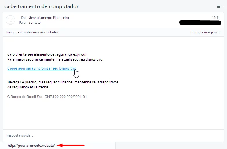 No exemplo acima, os criminosos tentam simular um e-mail do Banco do Brasil, informando que a segurança do dispositivo expirou e é necessário fazer uma atualização clicando no link.