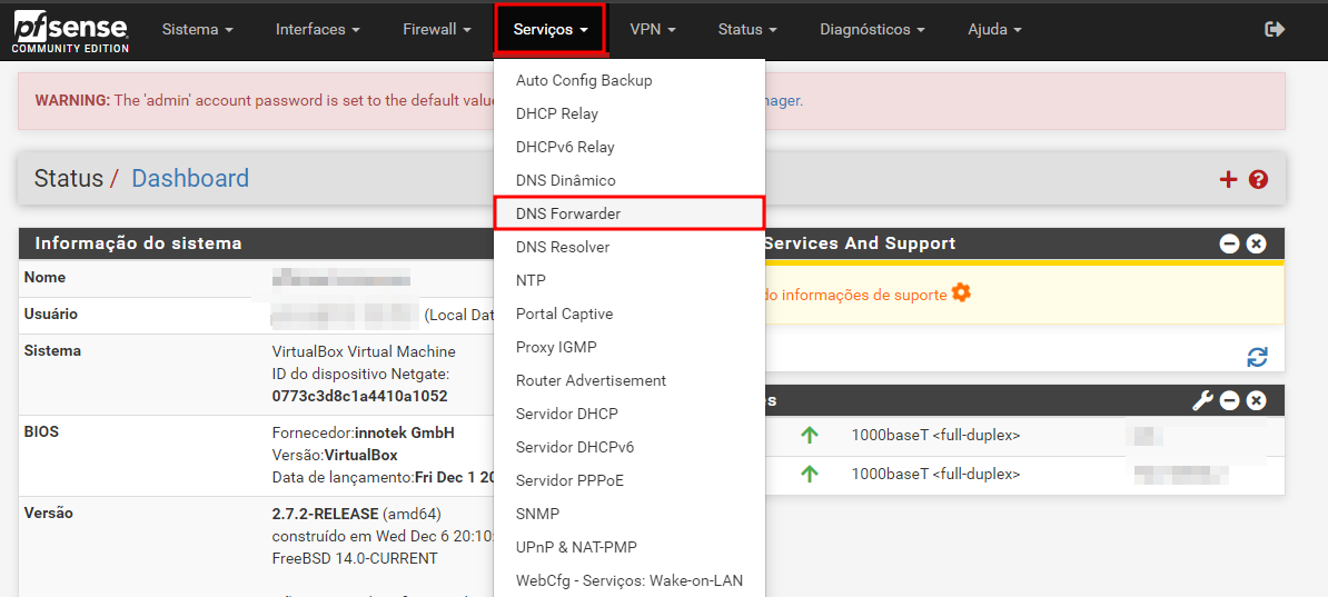 Acesse o menu de configuração do DNS Forwarder por meio do seguinte caminho: Serviços (Services) → DNS Forwarder.