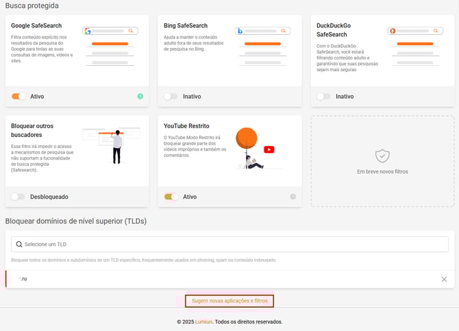 O Lumiun DNS oferece uma ampla variedade de filtros organizados em diferentes categorias, que ajudam a bloquear conteúdos indesejados e proteger a rede. No entanto, é possível que você não encontre um filtro específico para a sua necessidade. Nesses casos, você pode sugerir a criação de um novo filtro diretamente pelo painel Lumiun DNS.